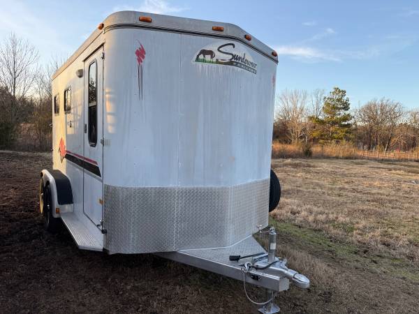Great solid and tall trailer, just had it serviced (bearings checked/packed/etc). Solid reliable trailer, can haul and fill big horses. Drop down windows work, back collapsible tack as well as front tack and dressing room. Back doors both open wide to fit ATV. Aluminum skin, steel frame. Clean title, cash only. Located in South Fort Smith AR. Text me for more info or to come see it. 479 six two 9- 8974 Thanks.